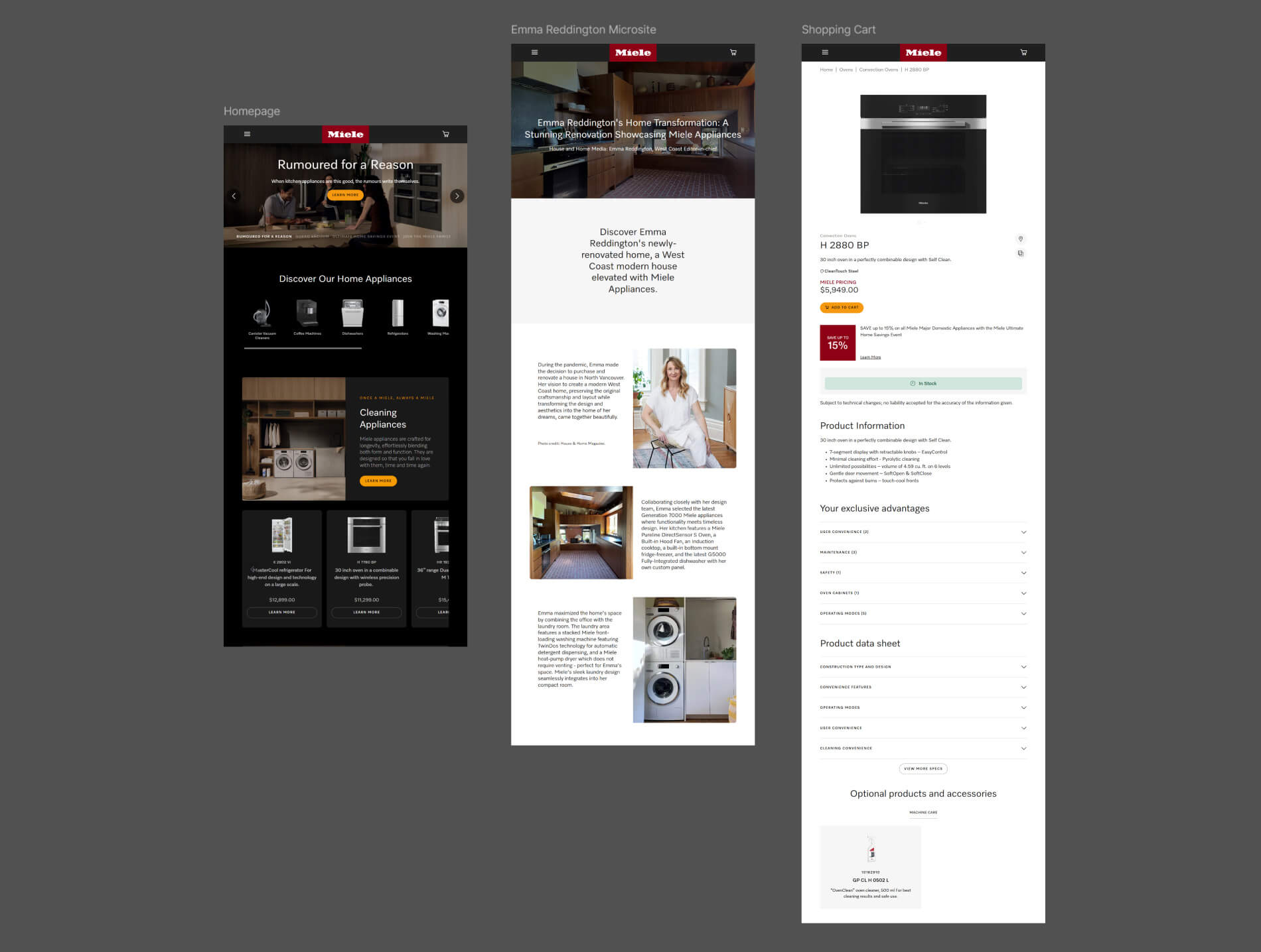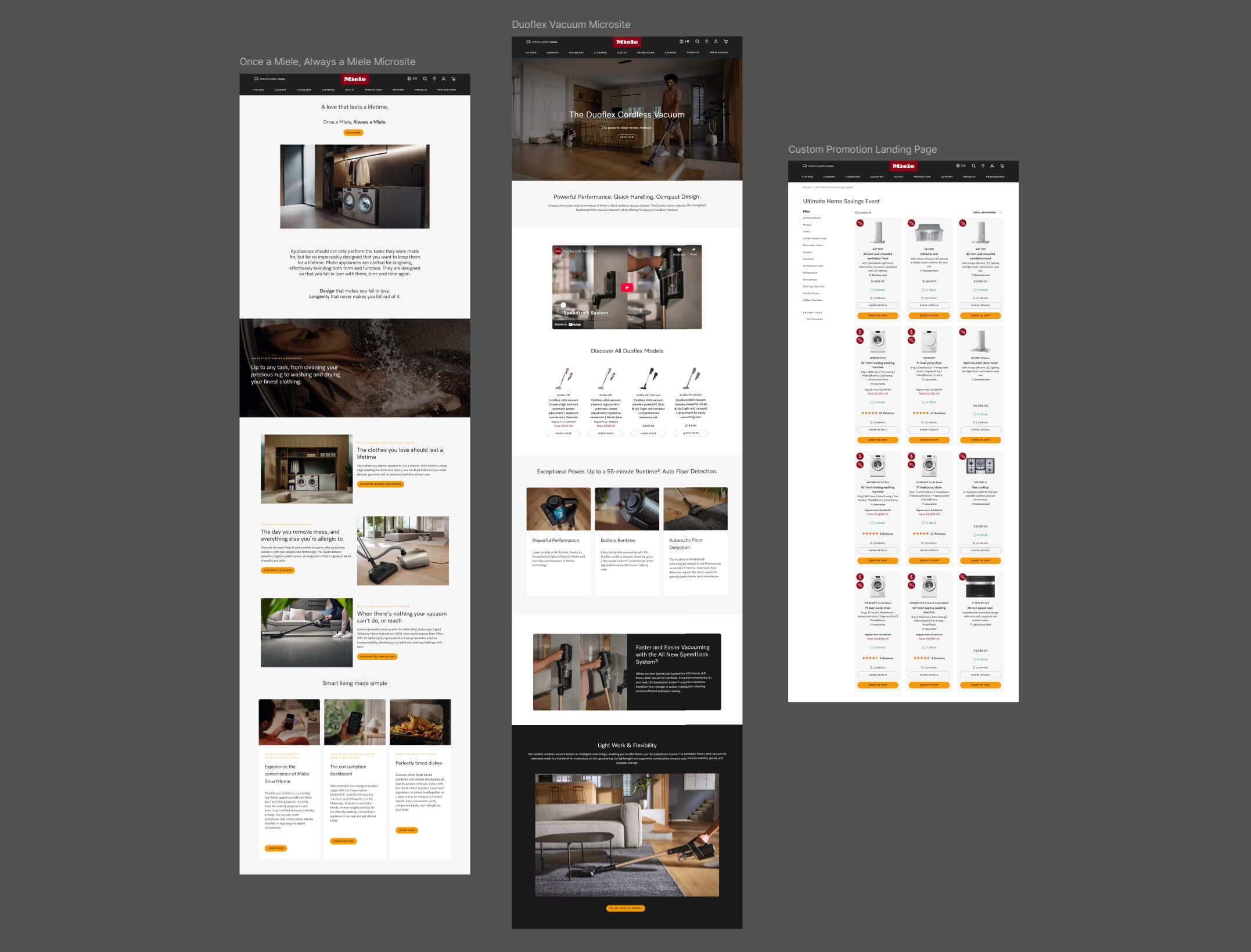 Microsite pages were created to spotlight Miele’s high-end domestic appliances, incorporating stylized text, immersive photography, and video. Strategically placed product cards encouraged exploration and streamlined the path to purchase.
